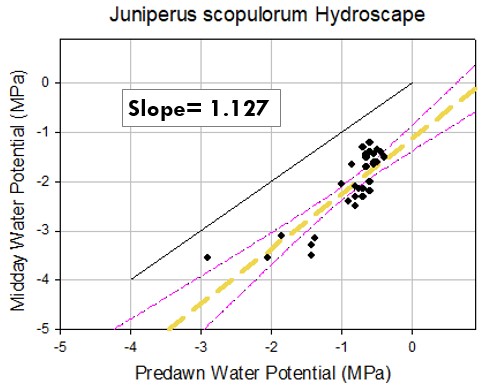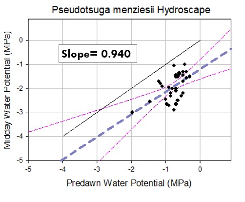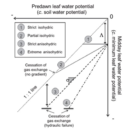Slope is used as an indicator of sample’s iso-/aniso-hydry. A steeper slope (>1.0) indicates a more anisohydric strategy, and a smaller slope (<1.0) indicates an isohydric strategy.