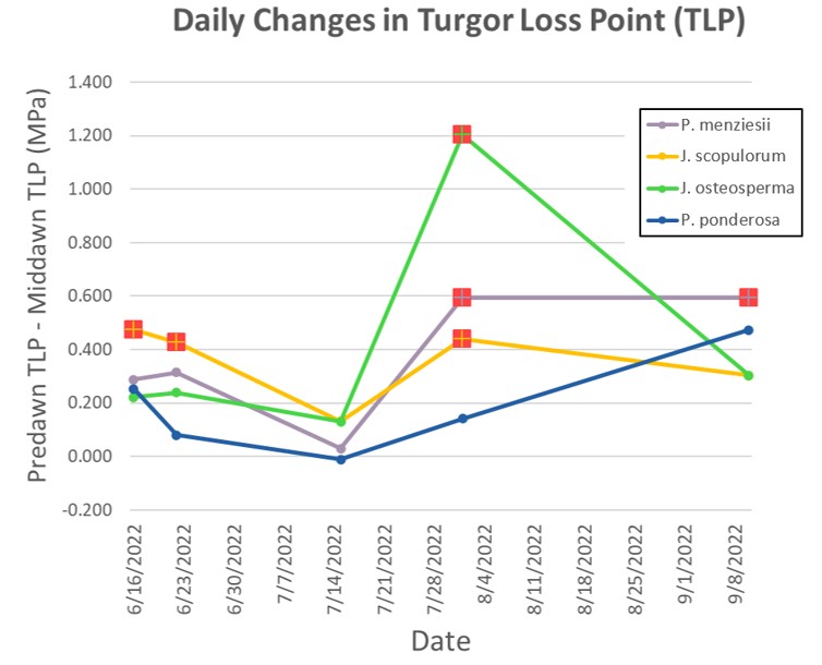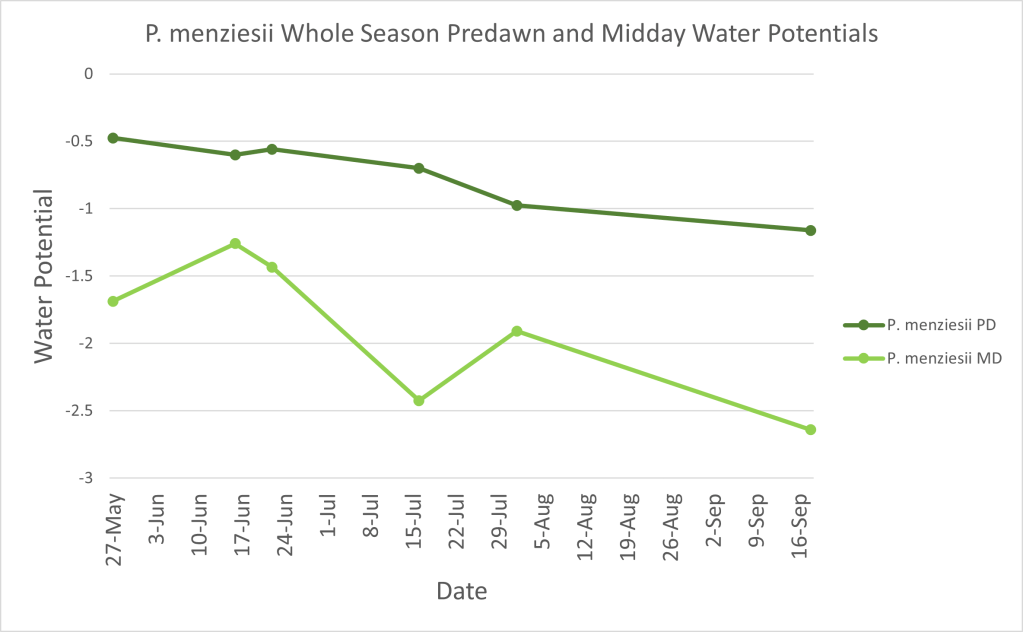 These are preliminary graphs to assist in giving context to the plants’ average predawn and midday water potentials through the season.